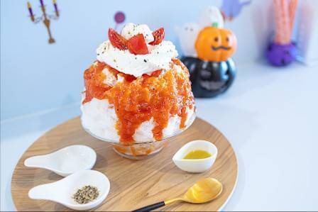 こおりかふぇ melty Uでは、バーナーで炙って外側がパリパリになったかぼちゃブリュレや、たくさんのフルーツシロップをたっぷり加えた味付きのかき氷など、さまざまなスイーツを提供しています。