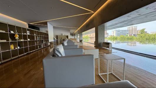 このカフェは秋田県立美術館の2階にあります。美術館には秋田の行事と藤田嗣治の作品が多数展示されています。美術館の中にあるカフェとお土産屋さんで、眺めが素敵です。水に映る景色を眺めながらお茶出来ます。